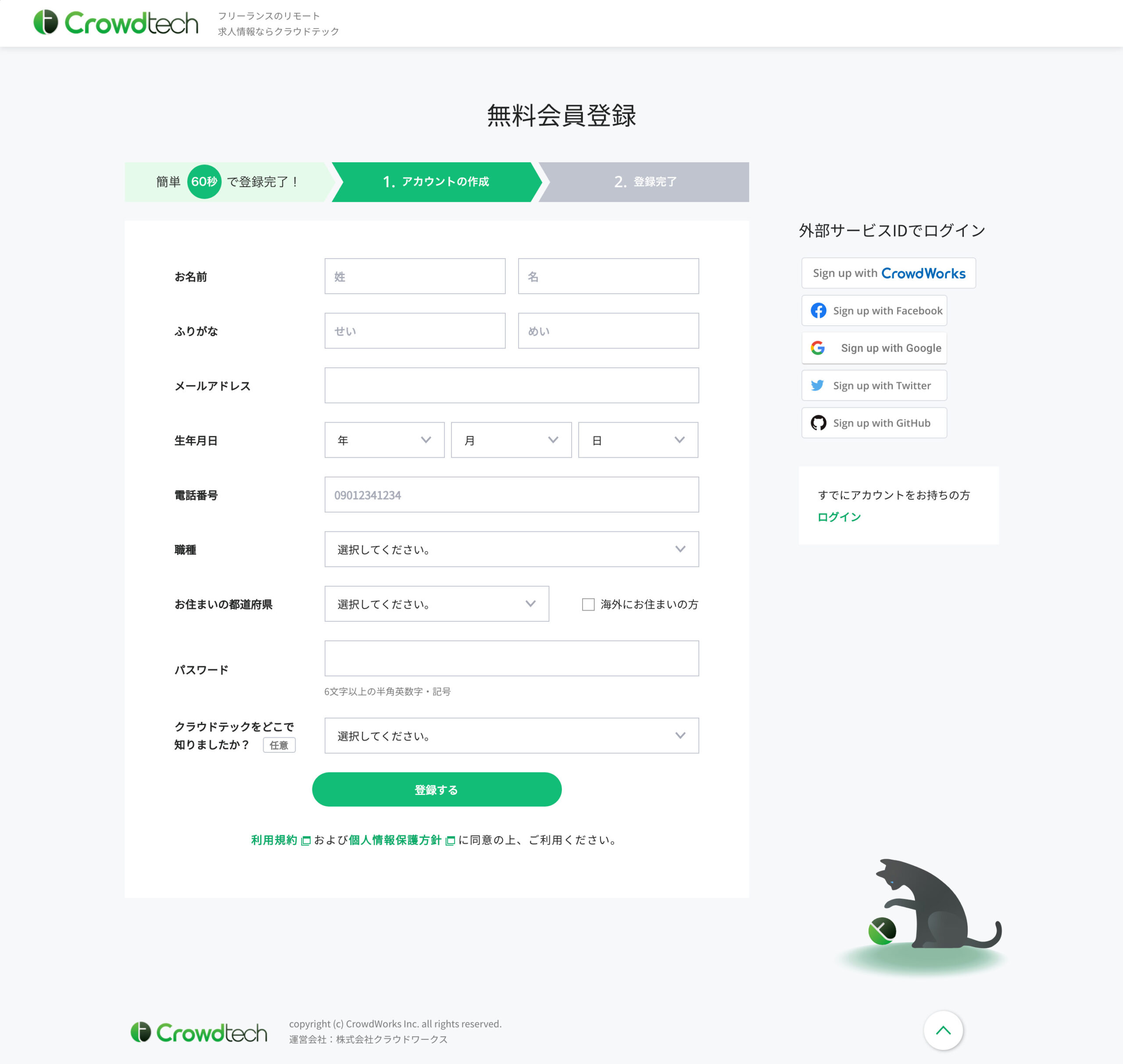 上の画像と同じページに入れた方は全ての項目を入力しましょう。『職種』の項目はひとつしか選択できないので最も適した職種を選びましょう。ちなみに筆者はWebコーダーを選択しました。パスワードはログインの際に必要となるので慣れ親しんだモノを使うのがいいかと思います。全項目の入力ができた方は『登録する』を選択して完了です。