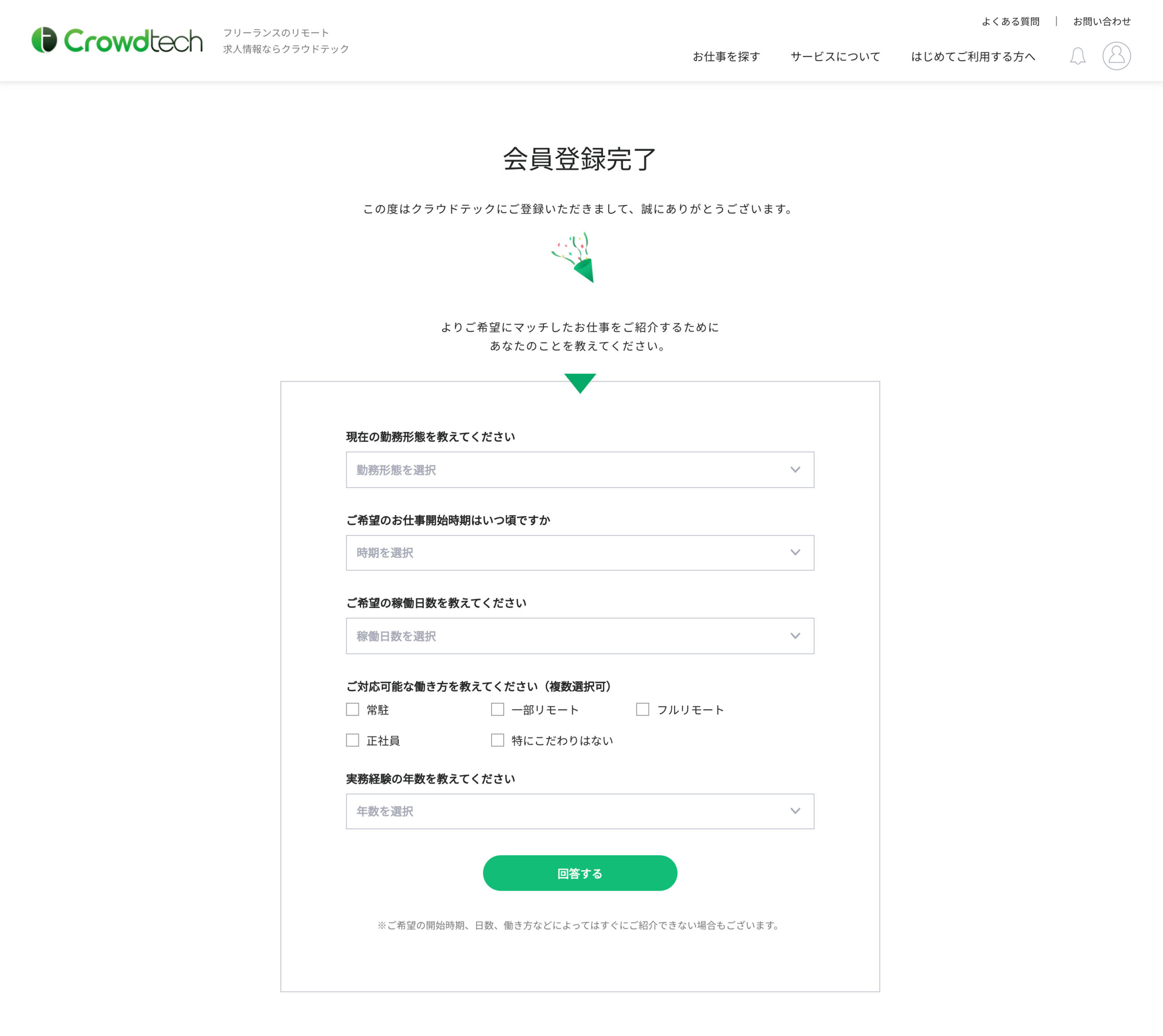 会員情報の入力が無事にできた方は上の画像のような『会員登録完了』画面に移るかと思います。少し面倒ではありますが、ページ下部にある項目も入力をして『回答する』を選択しましょう。これで会員登録は完了です。
