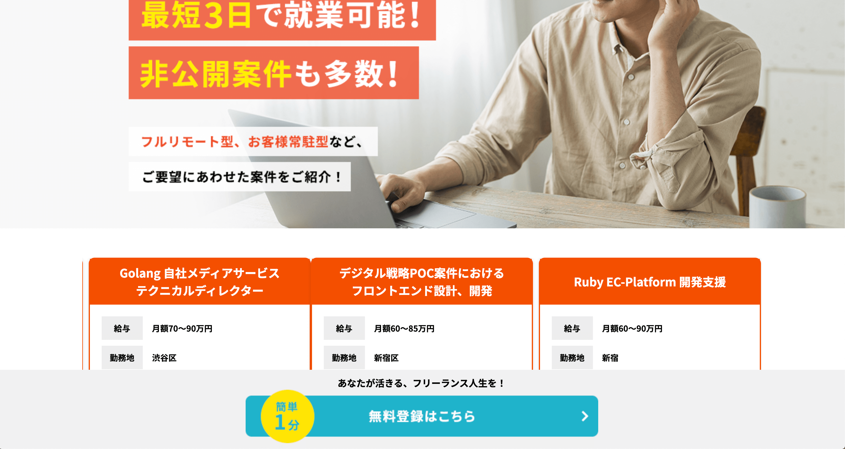 デメリットはいくつかありましたが、、高単価マッチング精度の高さ5000以上の優良案件信頼性最短3日で案件獲得など、こんなにもフリーランス初心者に優しい案件・求人サイトは見たことがありません。実際に使っていただければ、良さがわかるかと思います。