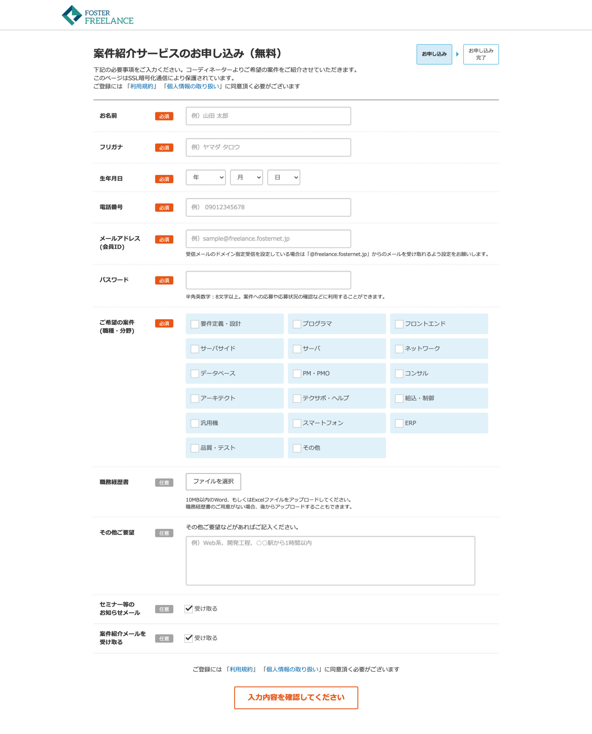 まずはフォスターフリーランス公式サイトから『無料登録はこちら』ボタンを押して会員情報入力ページに進んでください。(上の画像参考)